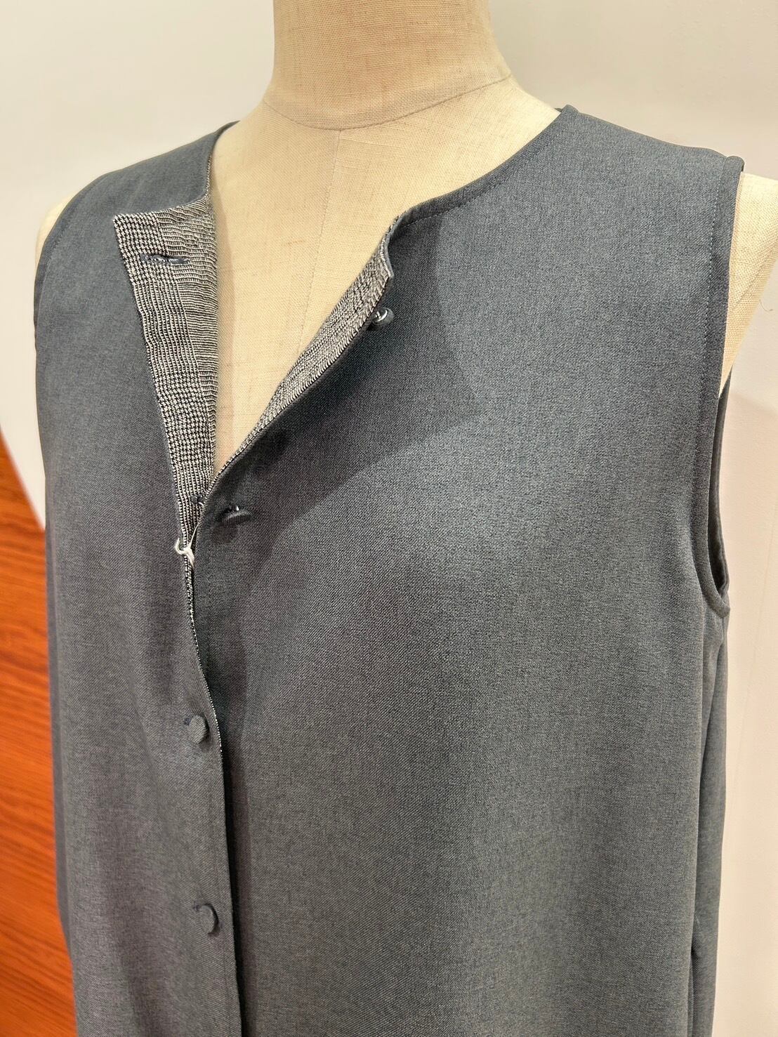 襟元の裏側にはさりげなくチェック柄を施し、ボタンを少し開けた時や着脱時に見える遊び心もポイント。