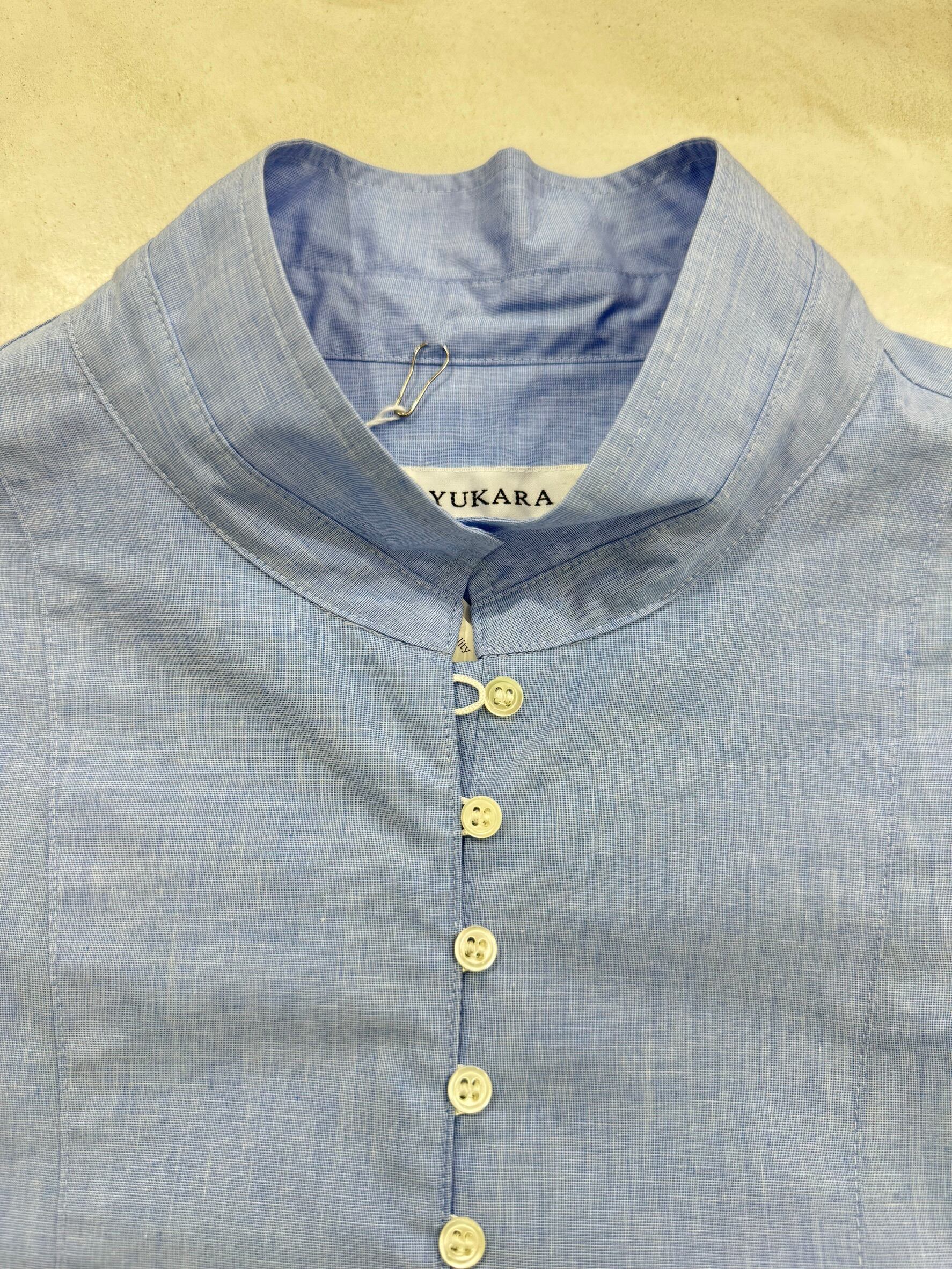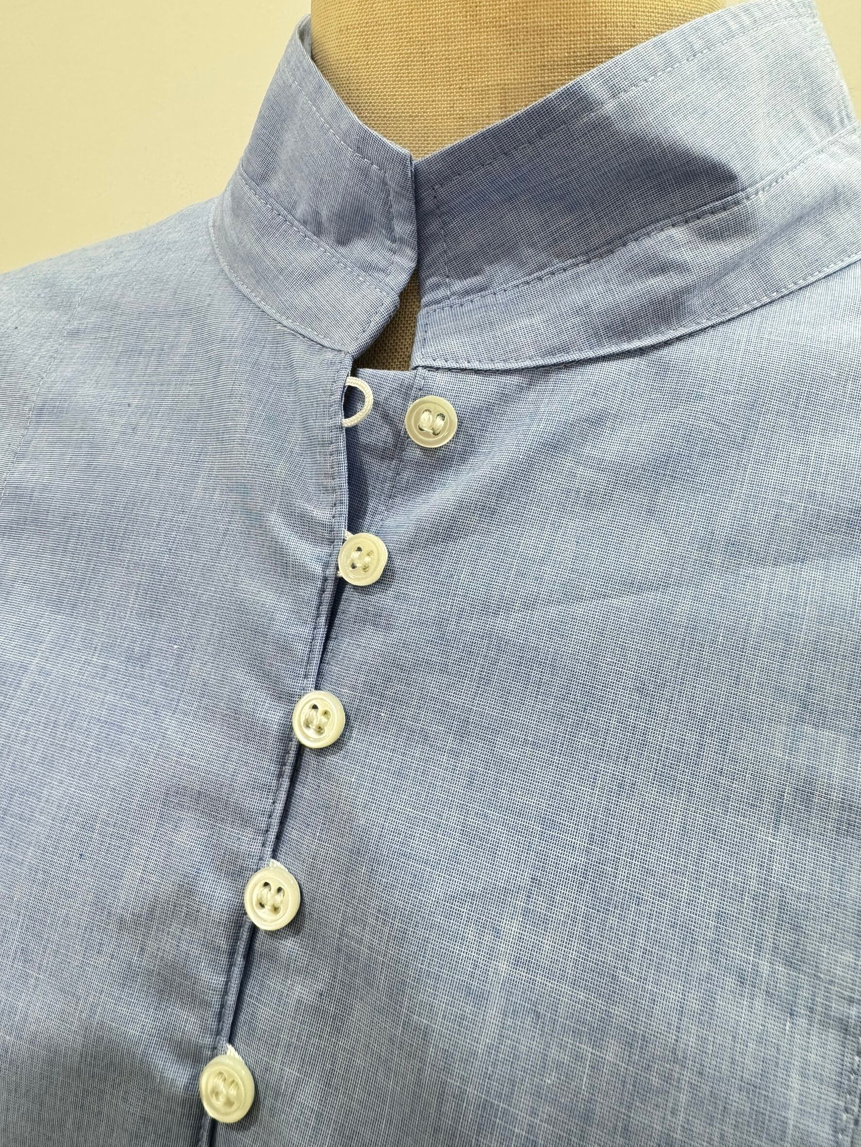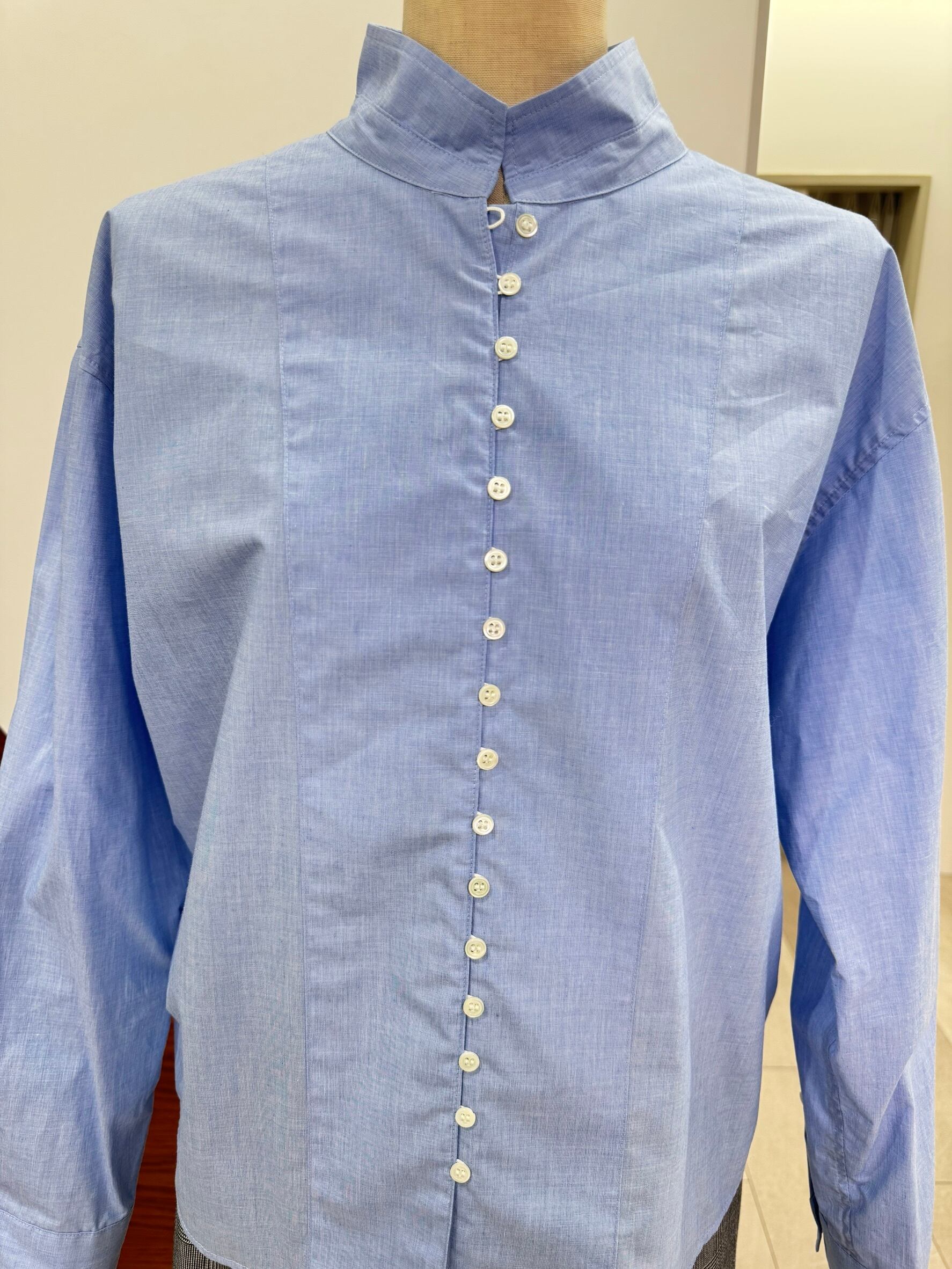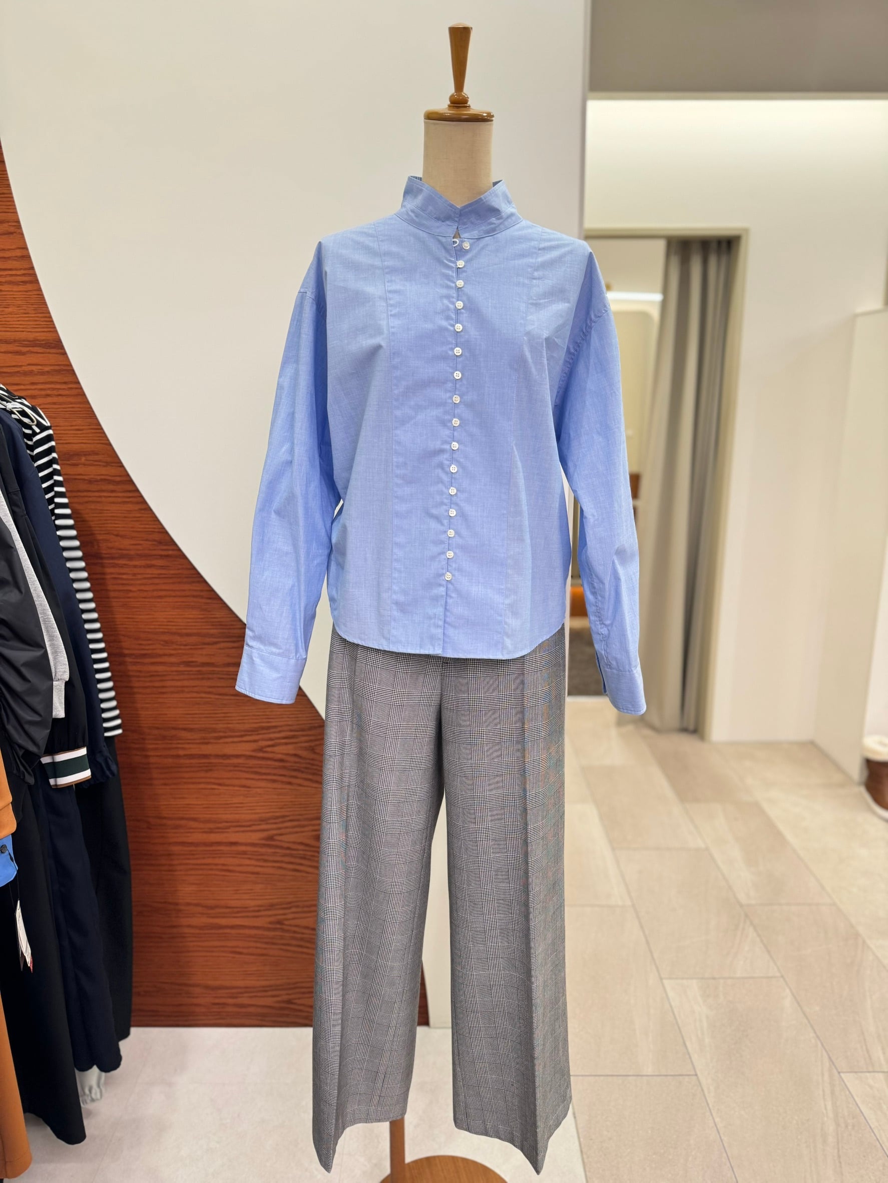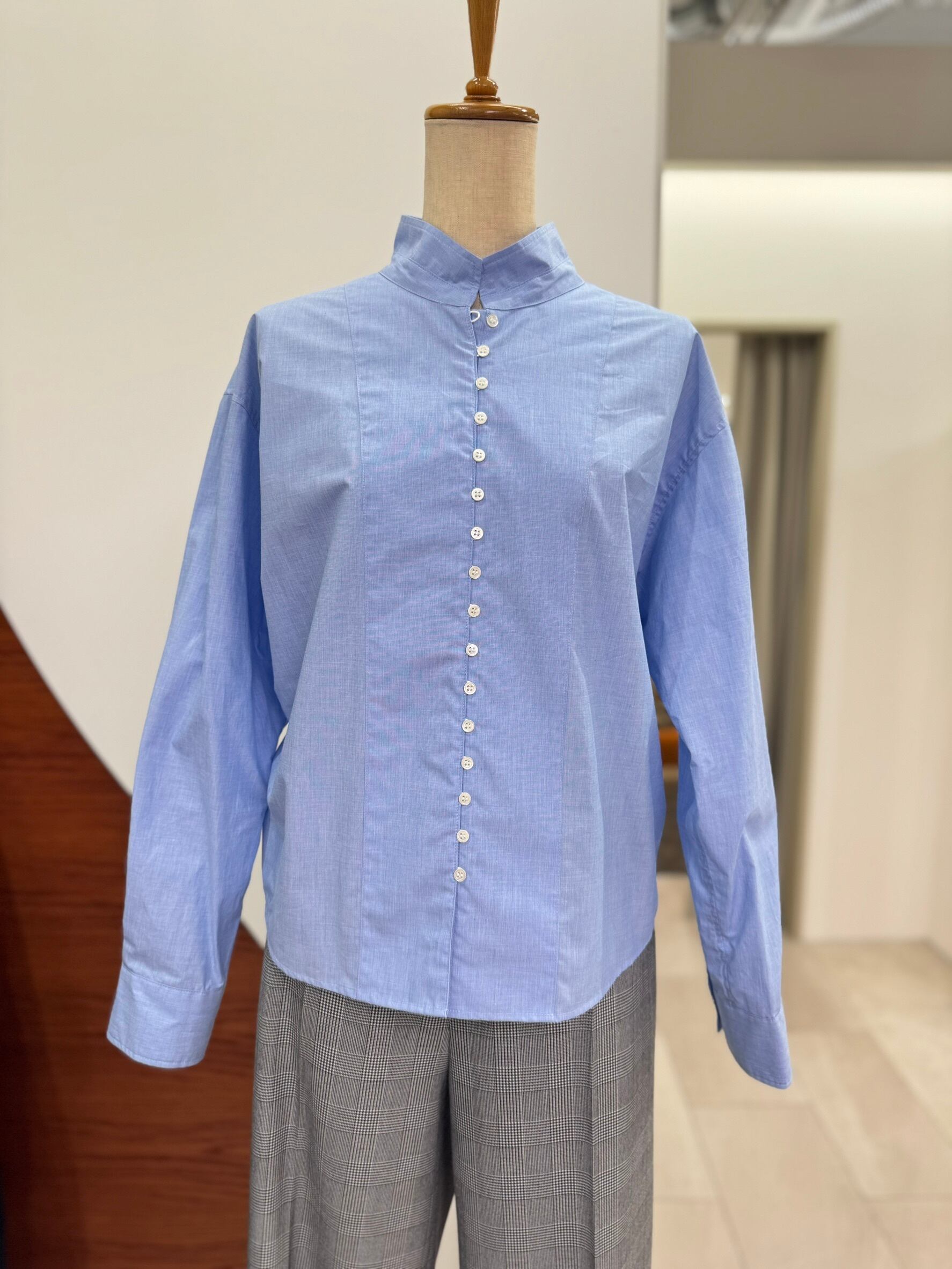首元はすっきりとしたスタンドカラー仕様で、程よくきちんと感がありながらも、リラックスした雰囲気を演出します。