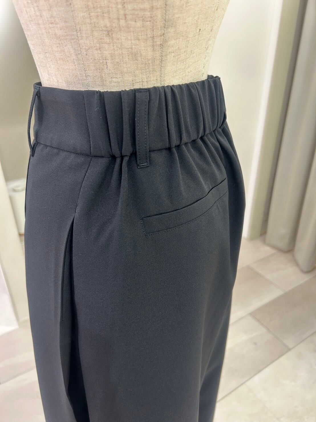 後ろウエストはゴム仕様で、きちんと感がありながらストレスフリーな穿き心地。